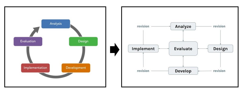 Ví dụ, mô hình ADDIE truyền thống (thường đánh giá sản phẩm là bước cuối cùng) giờ cũng đã chuyển đổi thành Iterative ADDIE để tích hợp việc lấy ý kiến, đánh giá của người học liên tục trong cả quy trình thiết kế.