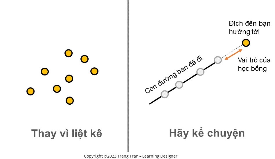 Ví dụ: Khi đi phỏng vấn apply học bổng đi du học, thay vì nói “tôi tốt nghiệp trường A, được thành tích B, sau đó đi làm ở C, D, E…” hãy chuyển nó thành câu chuyện về điều mình muốn làm, vấn đề mình quan tâm và những chuyện đã xảy ra giúp mình thực hiện điều đó đến đâu, gặp vướng mắc gì, và vai trò của chương trình học bổng trên hành trình đó.