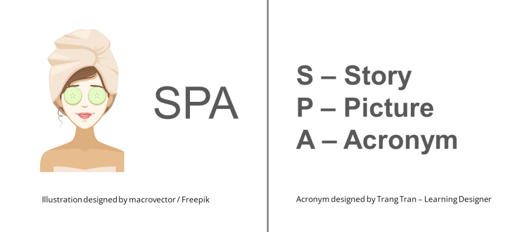 Có 3 phương pháp chunking phổ biến Trang thường sử dụng bao gồm: “Chunk” bằng câu chuyện, bằng hình ảnh, và bằng cụm từ viết tắt. Hay Trang hay gọi tắt là SPA (giúp người nghe dễ dàng tiếp thu thông tin như trả nghiệm đi spa)